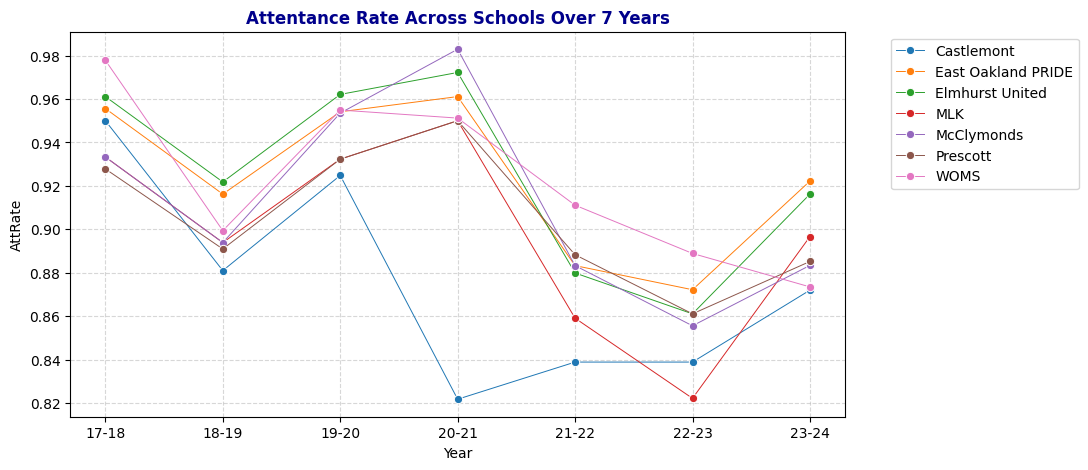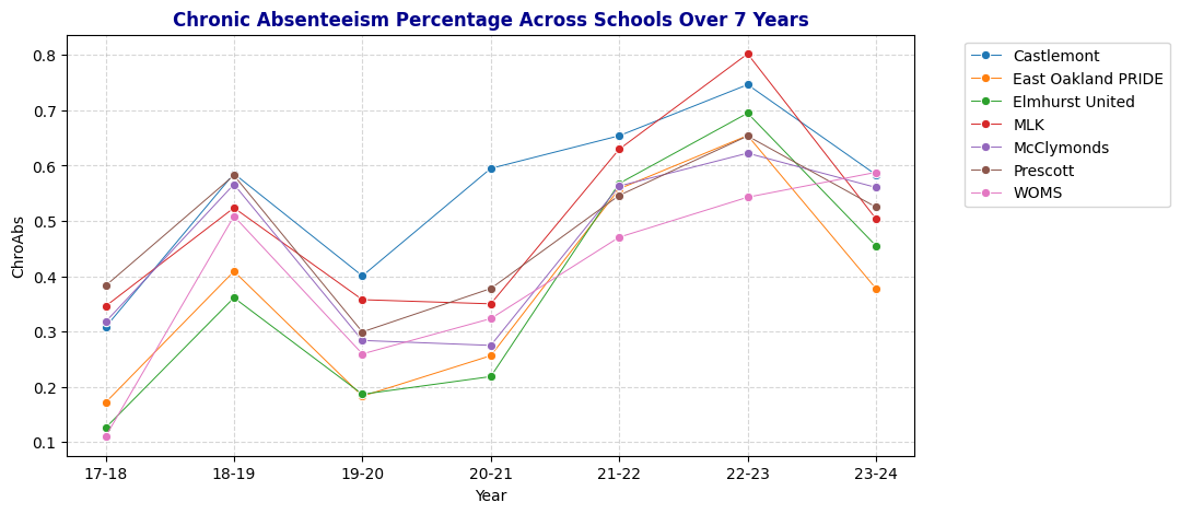 In this notebook, I analyze records from seven schools over seven academic years. My overarching goal is to identify patterns and predictors of chronic absenteeism, with the ultimate aim of guiding effective attendance-improvement strategies.