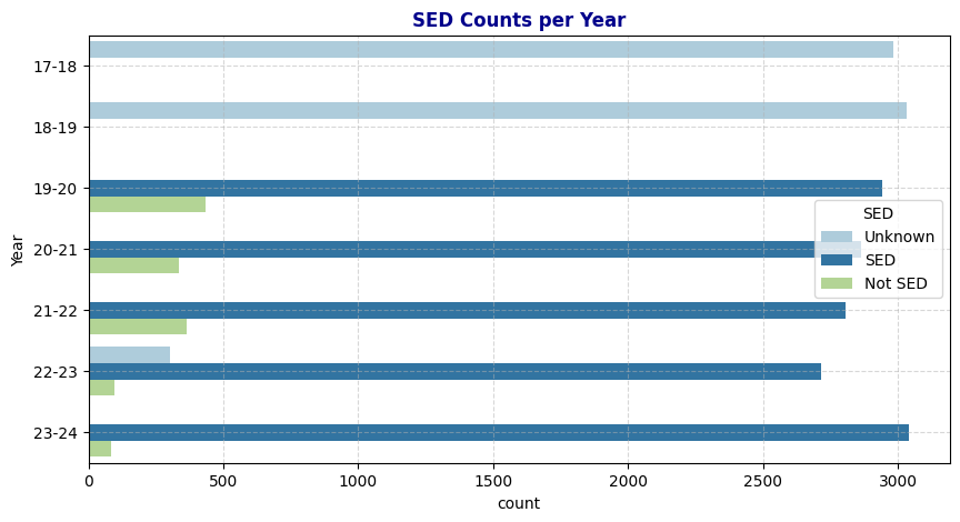 plt.title('SED Counts per Year', fontweight='bold', color='darkblue')