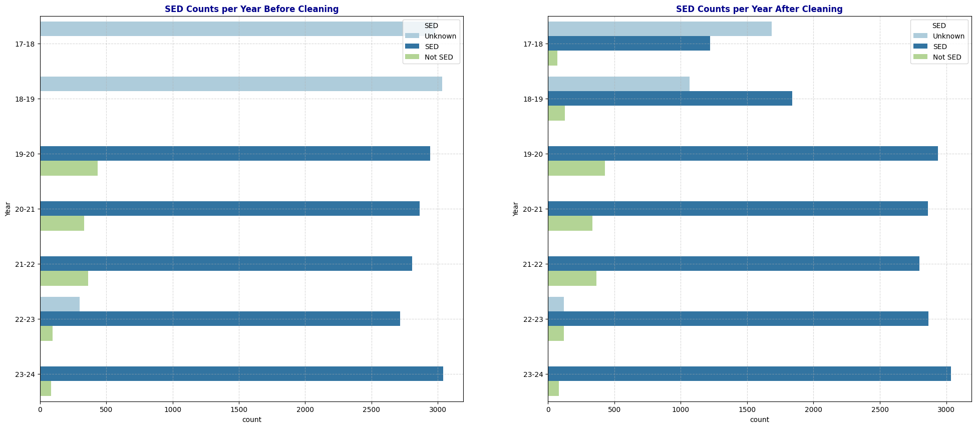 axs[1].set_title('SED Counts per Year After Cleaning', fontweight='bold', color='darkblue')